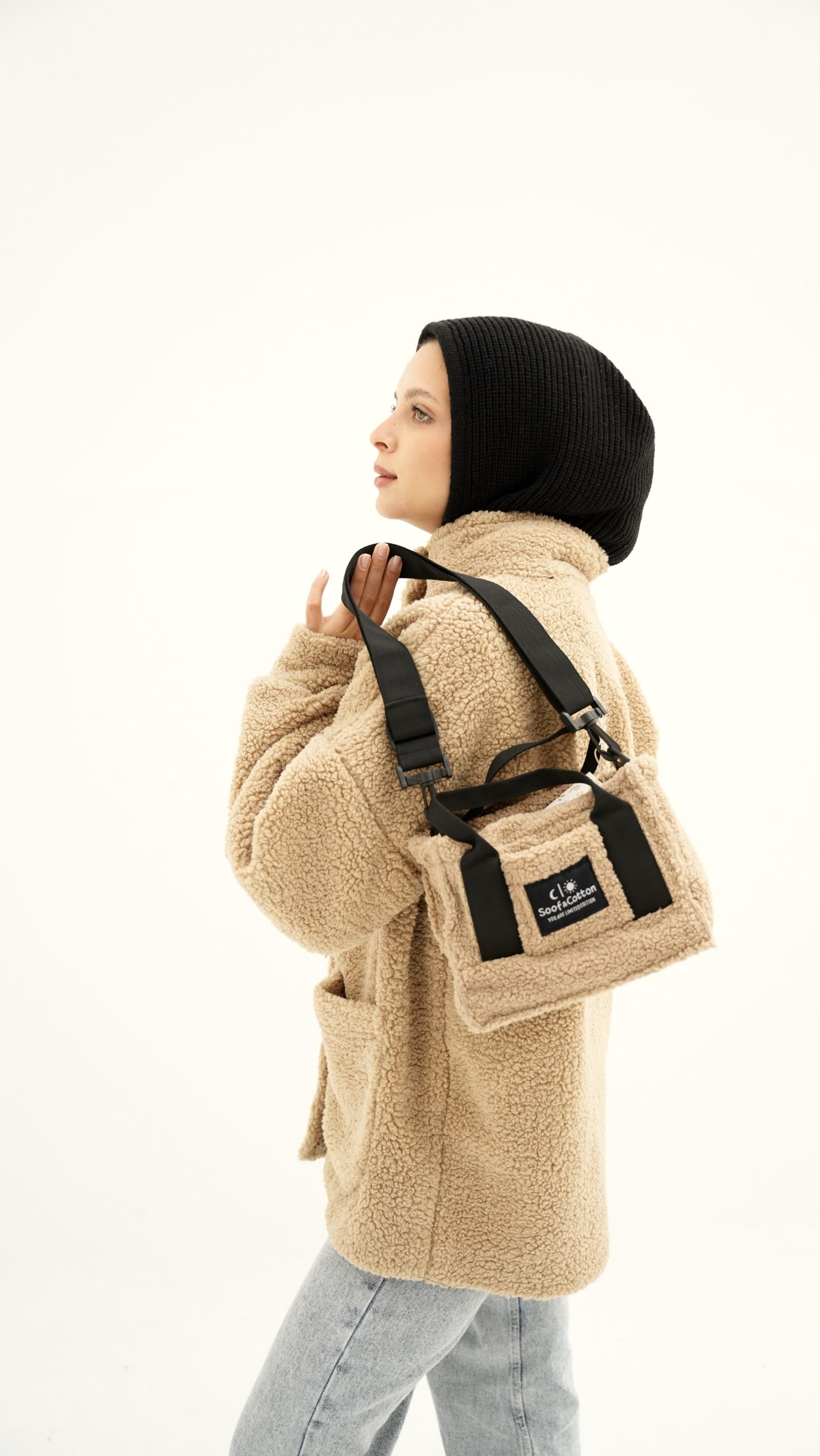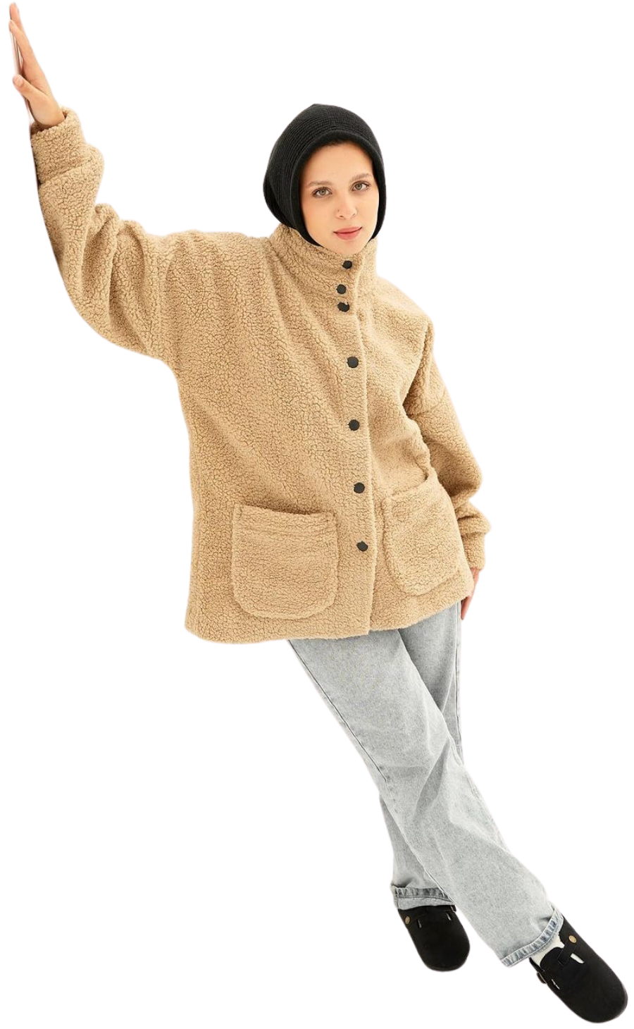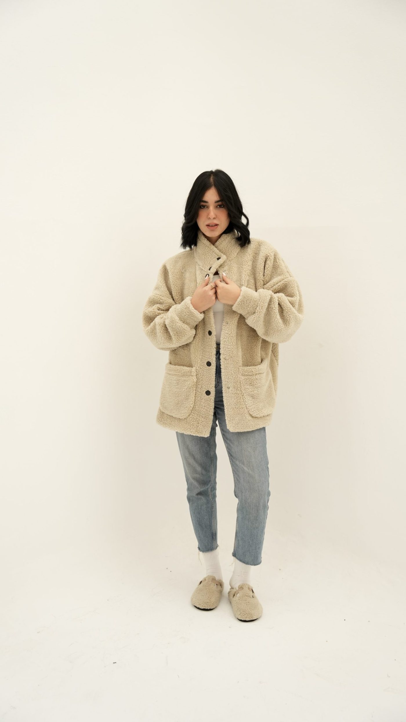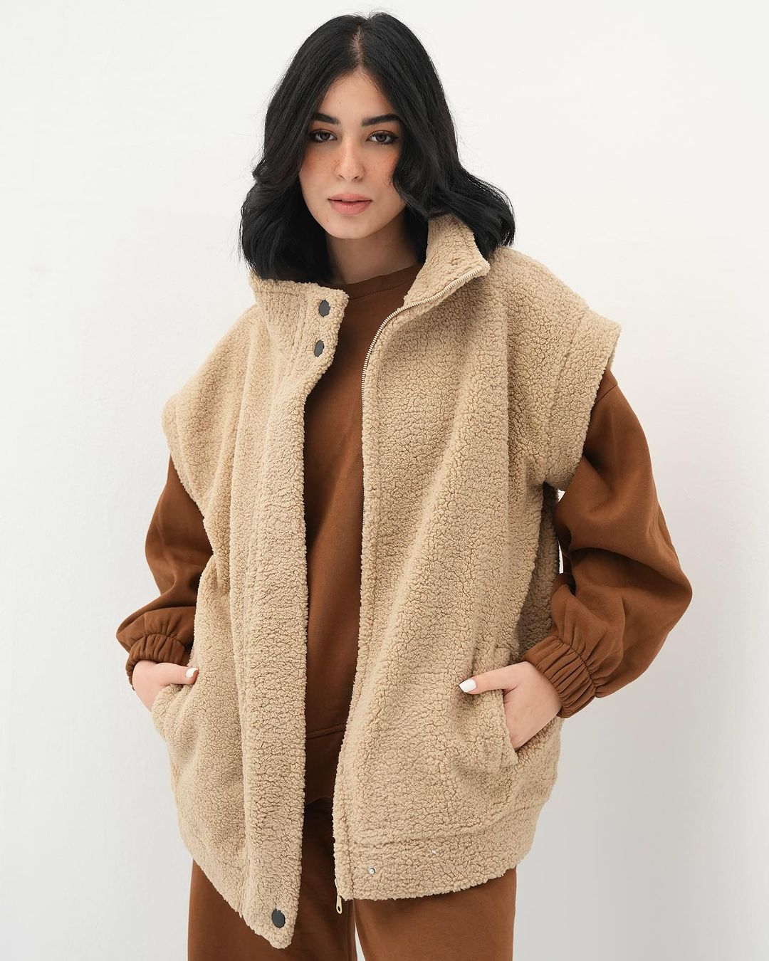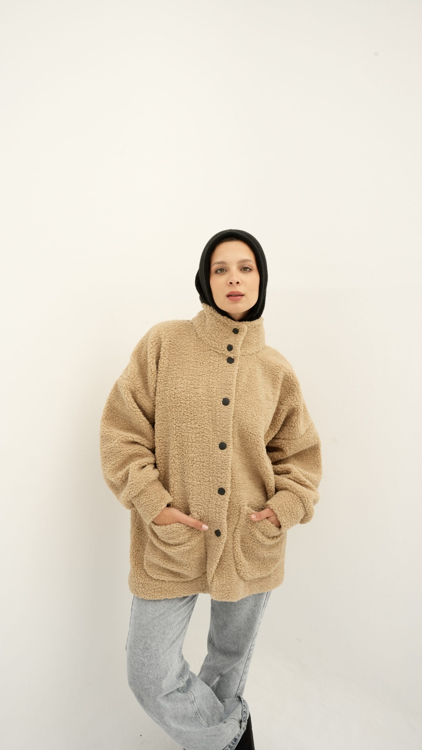 beige fur jacket with soft and comfortable design. It has front snap closure and practical side pockets, perfect for cold weather and a stylish everyday look one sizeEGP 950.00 -