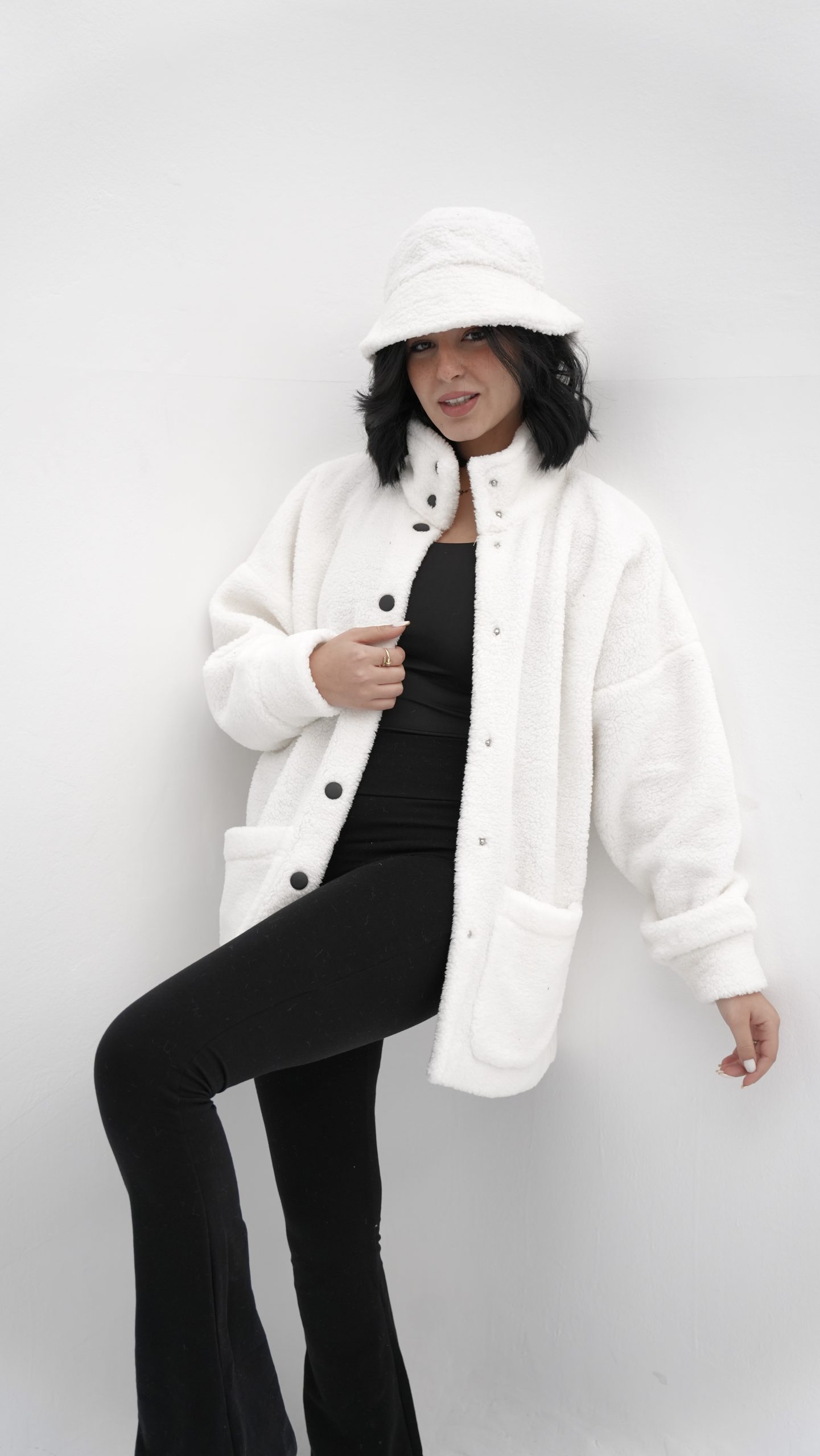 white fur jacket with soft and comfortable design. It has front snap closure and practical side pockets, perfect for cold weather and a stylish everyday look one sizeEGP 950.00 -
