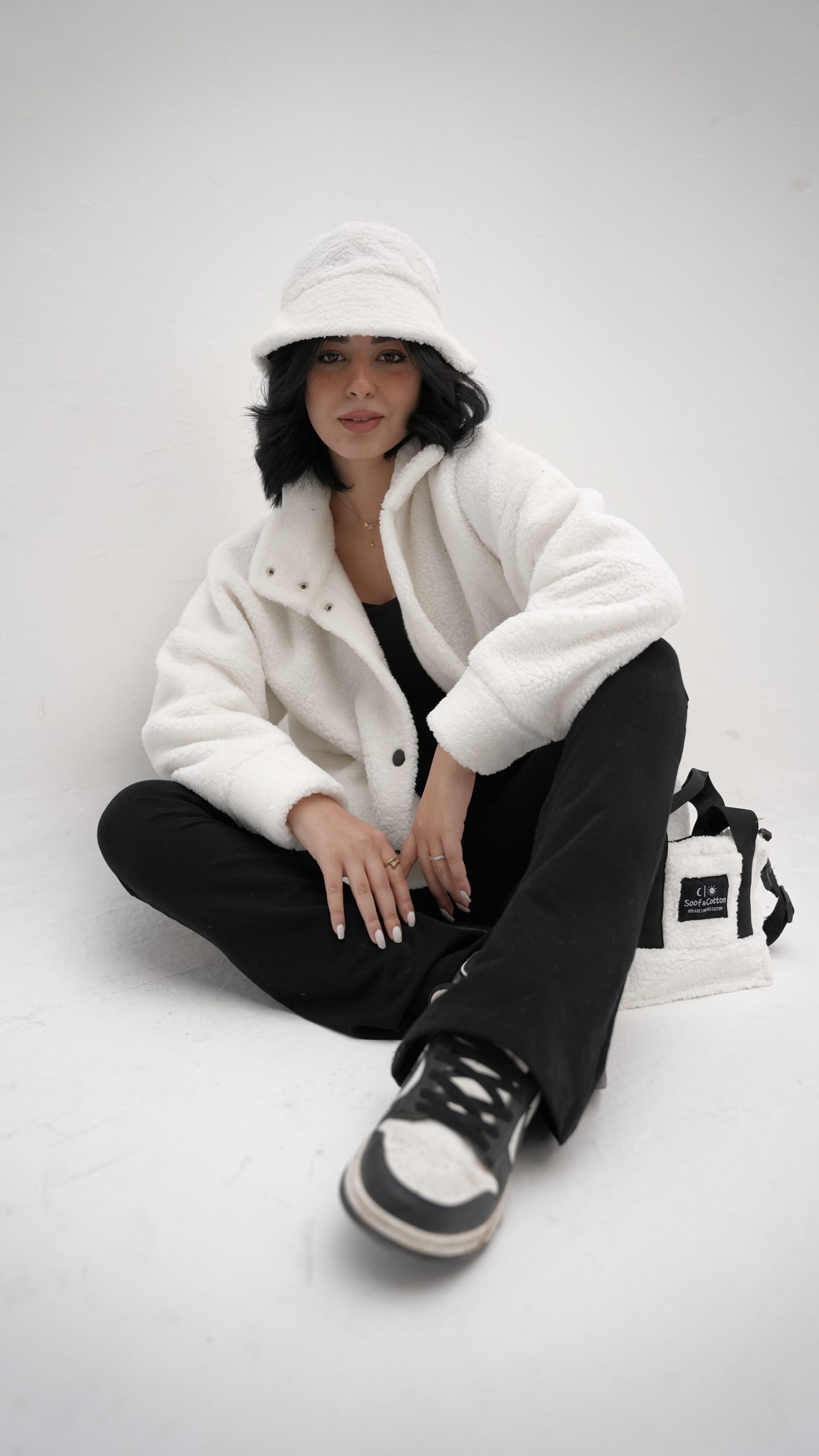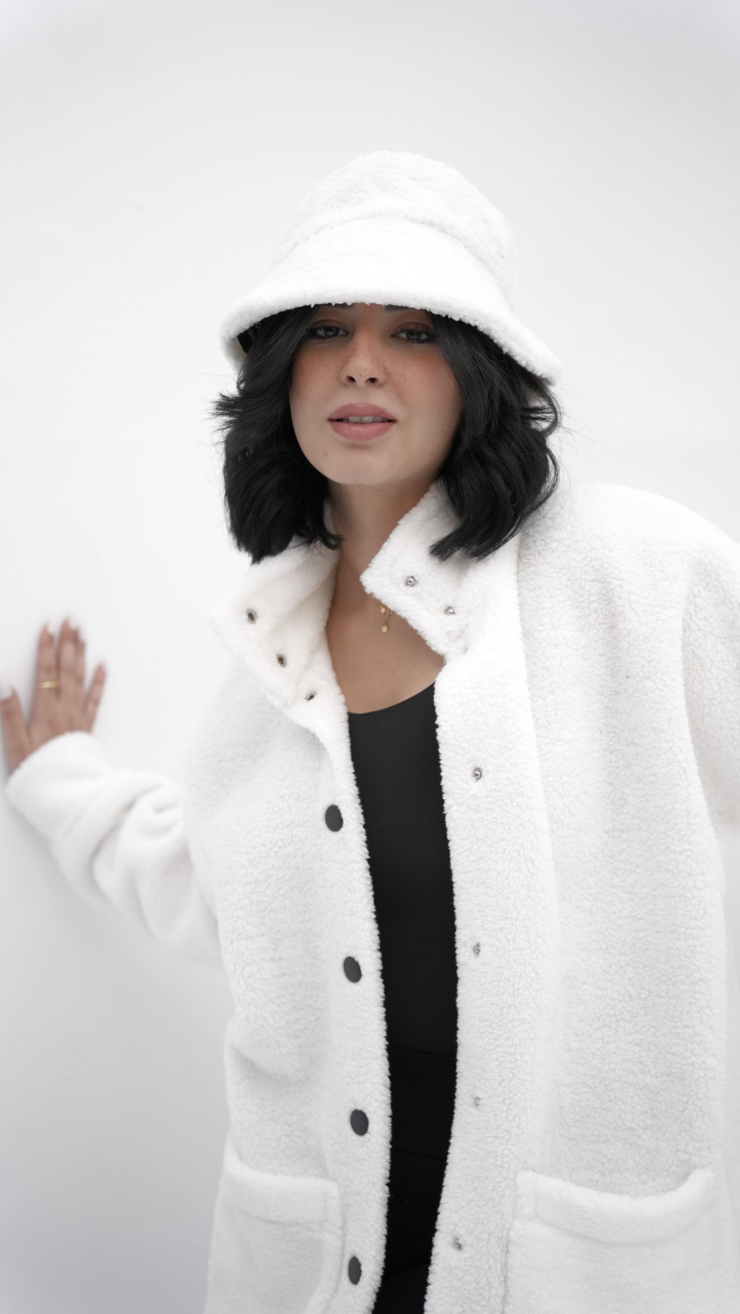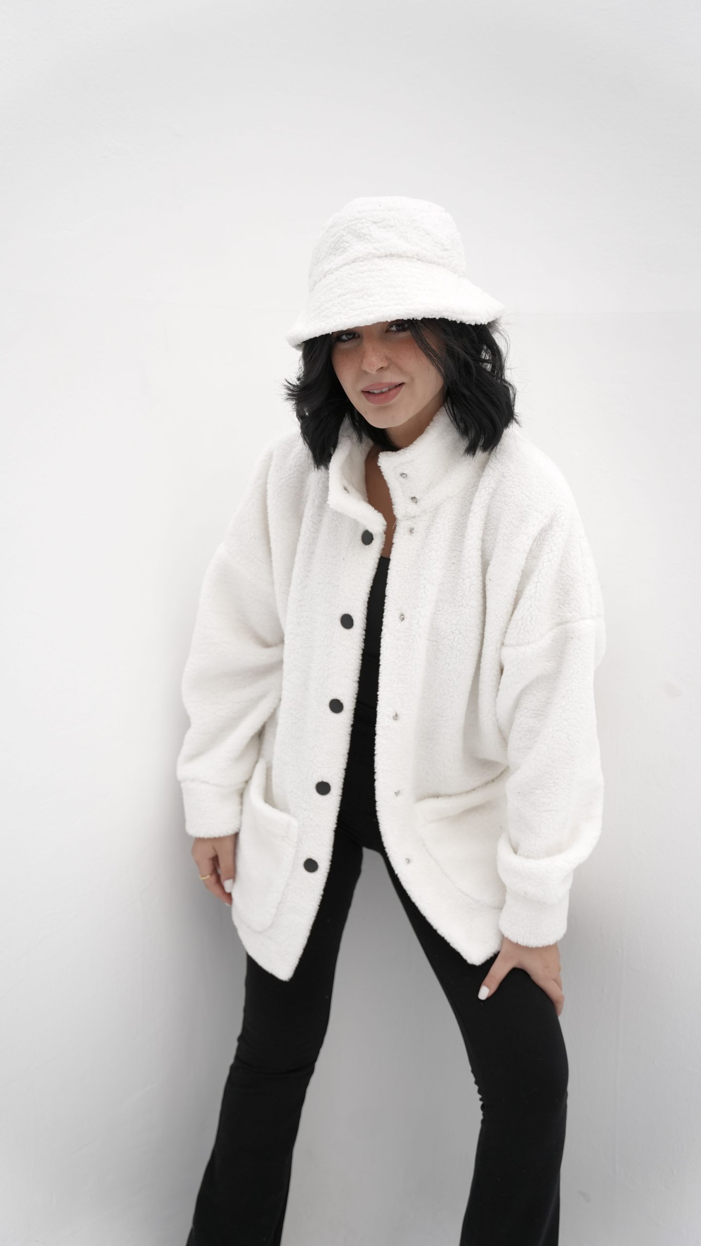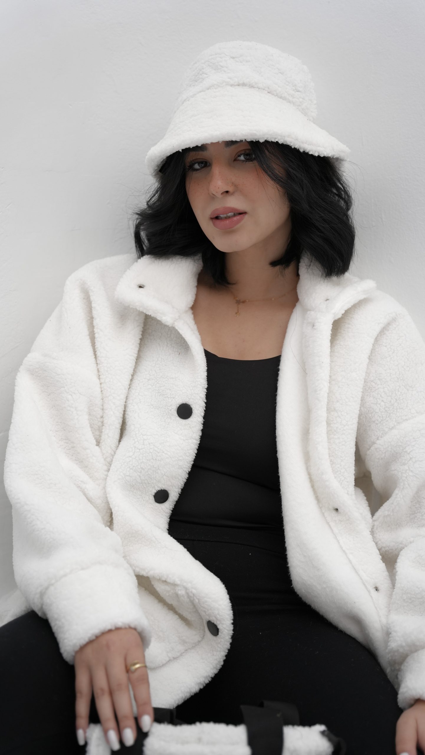 white fur jacket with soft and comfortable design. It has front snap closure and practical side pockets, perfect for cold weather and a stylish everyday look