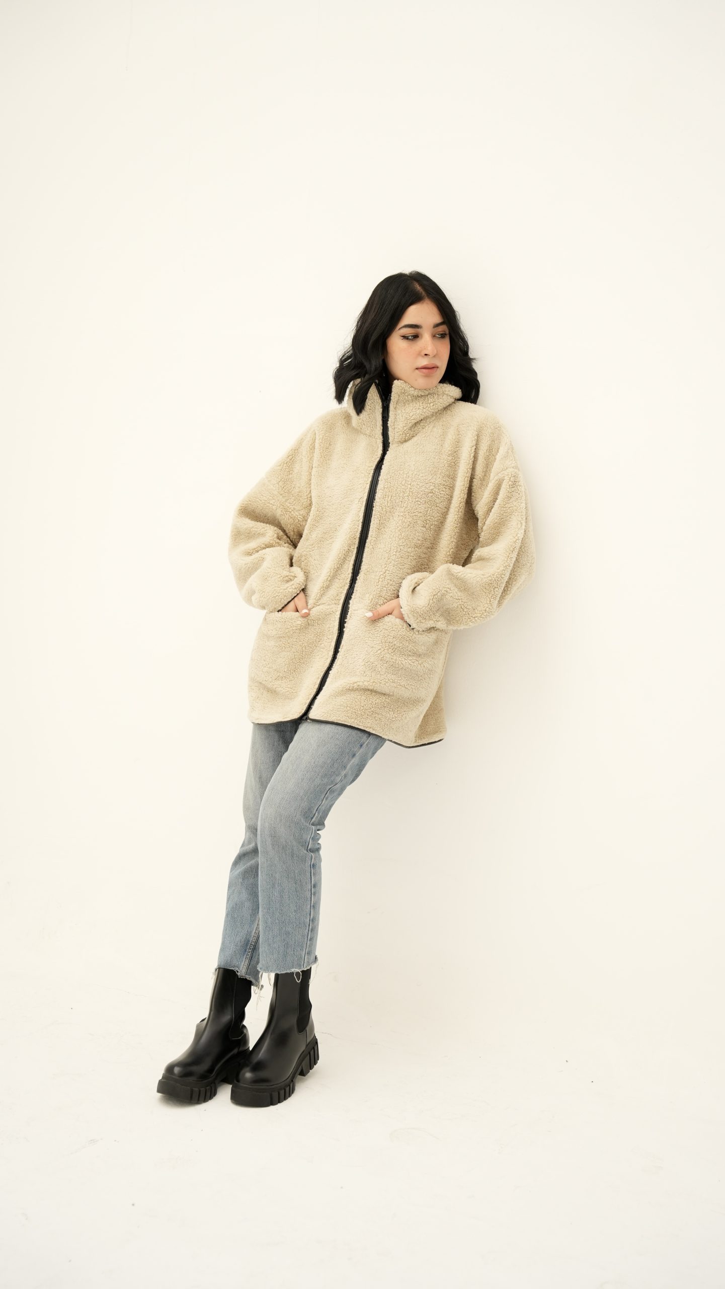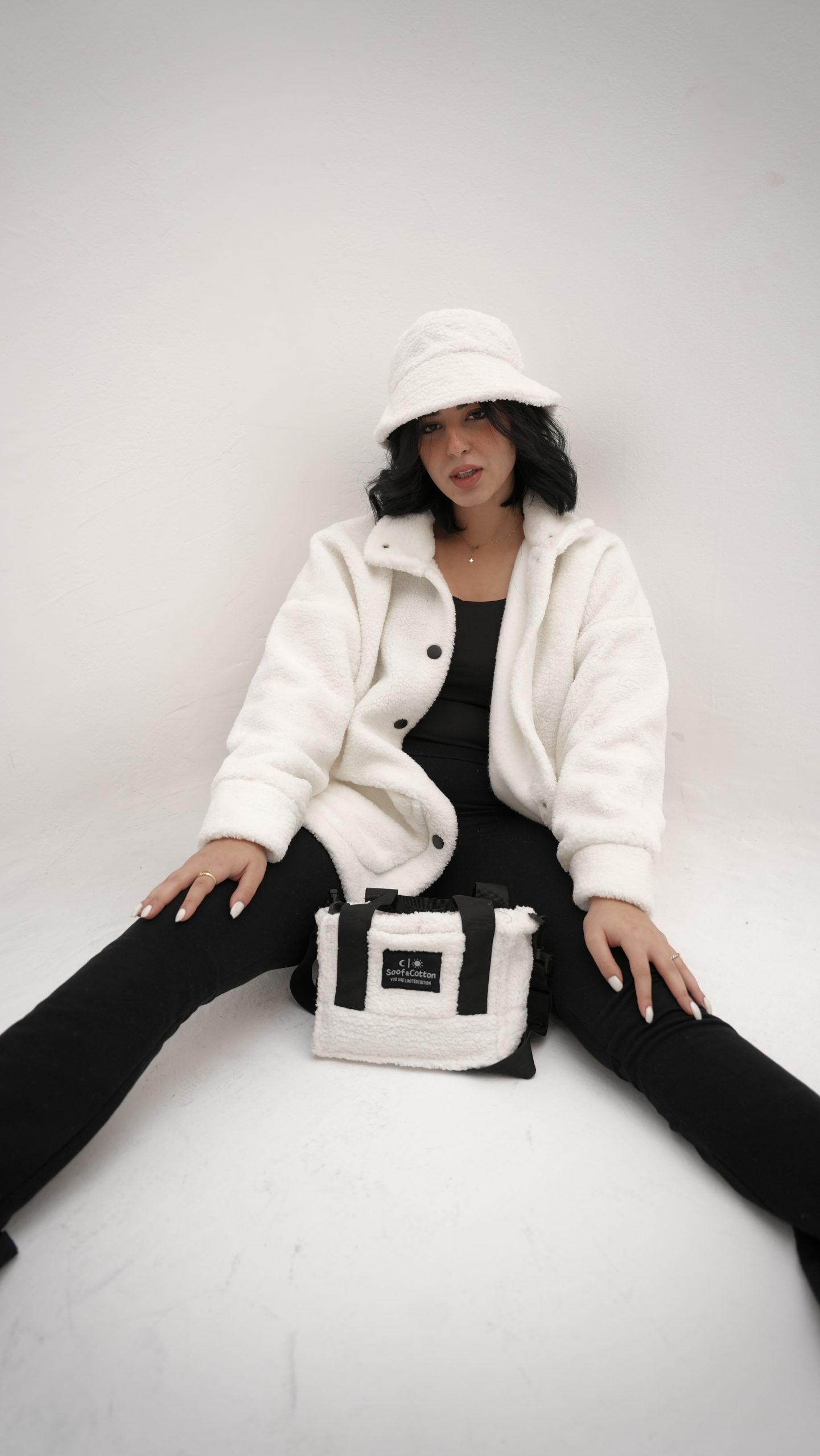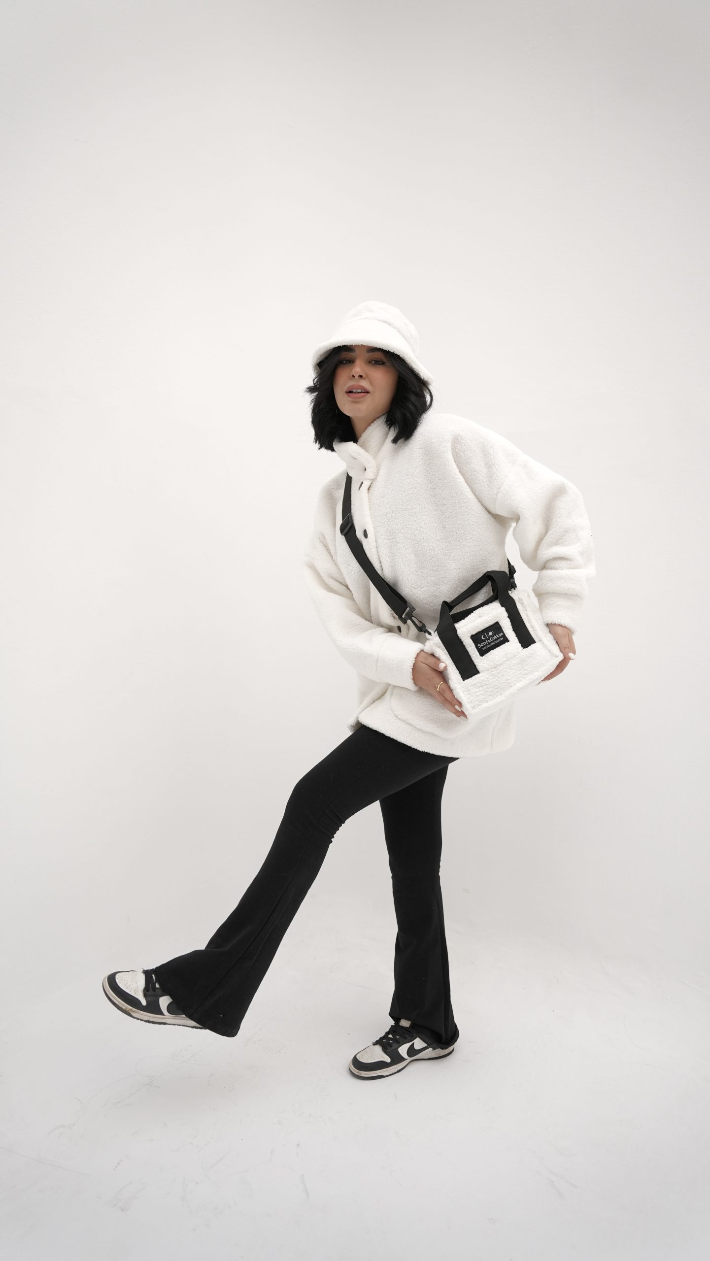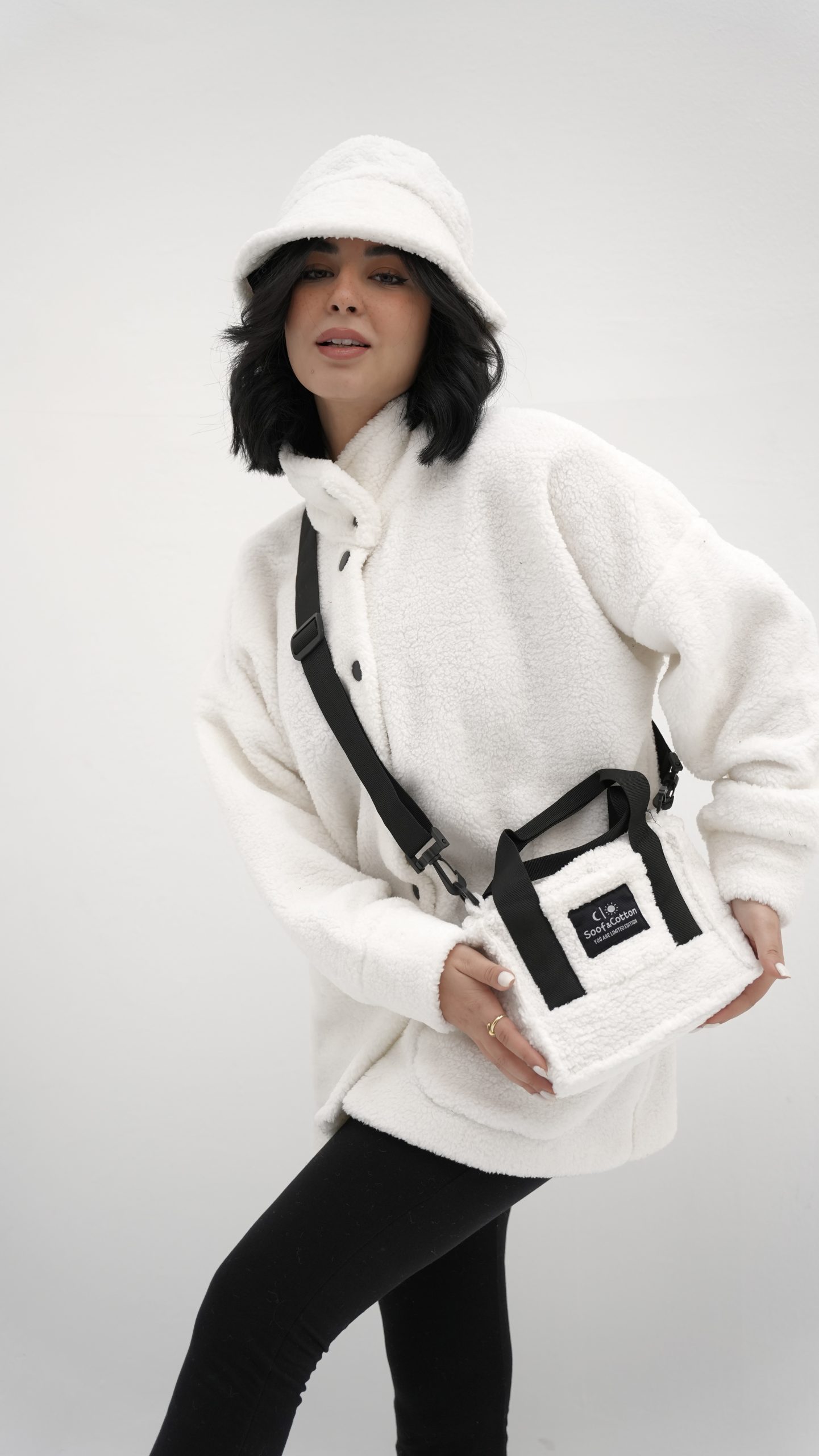 white fur jacket with soft and comfortable design. It has front snap closure and practical side pockets, perfect for cold weather and a stylish everyday look