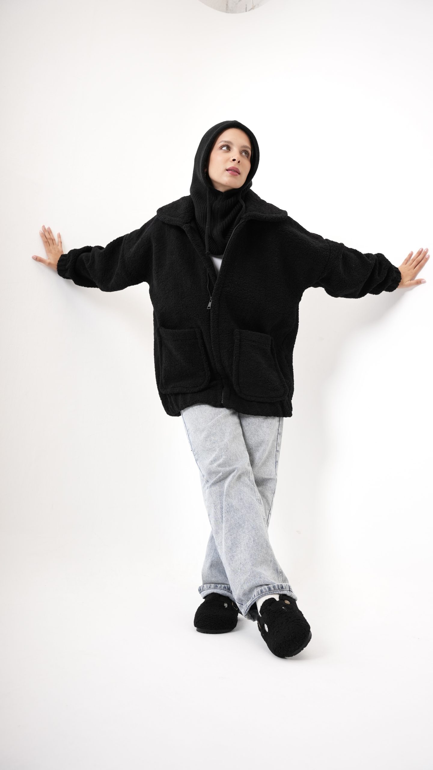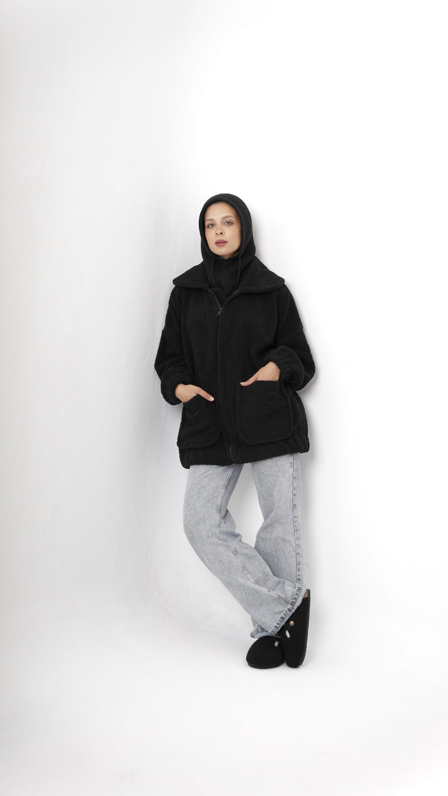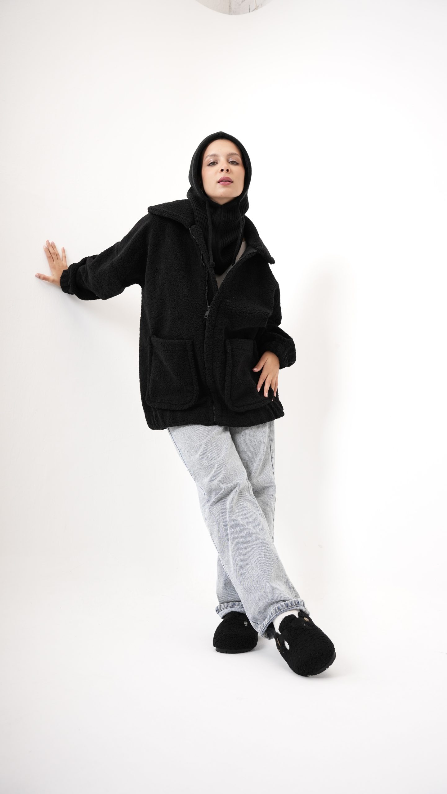 black fur jacket with soft and comfortable design. It has a front zipper closure and practical side pockets, perfect for cold weather and a stylish everyday look.