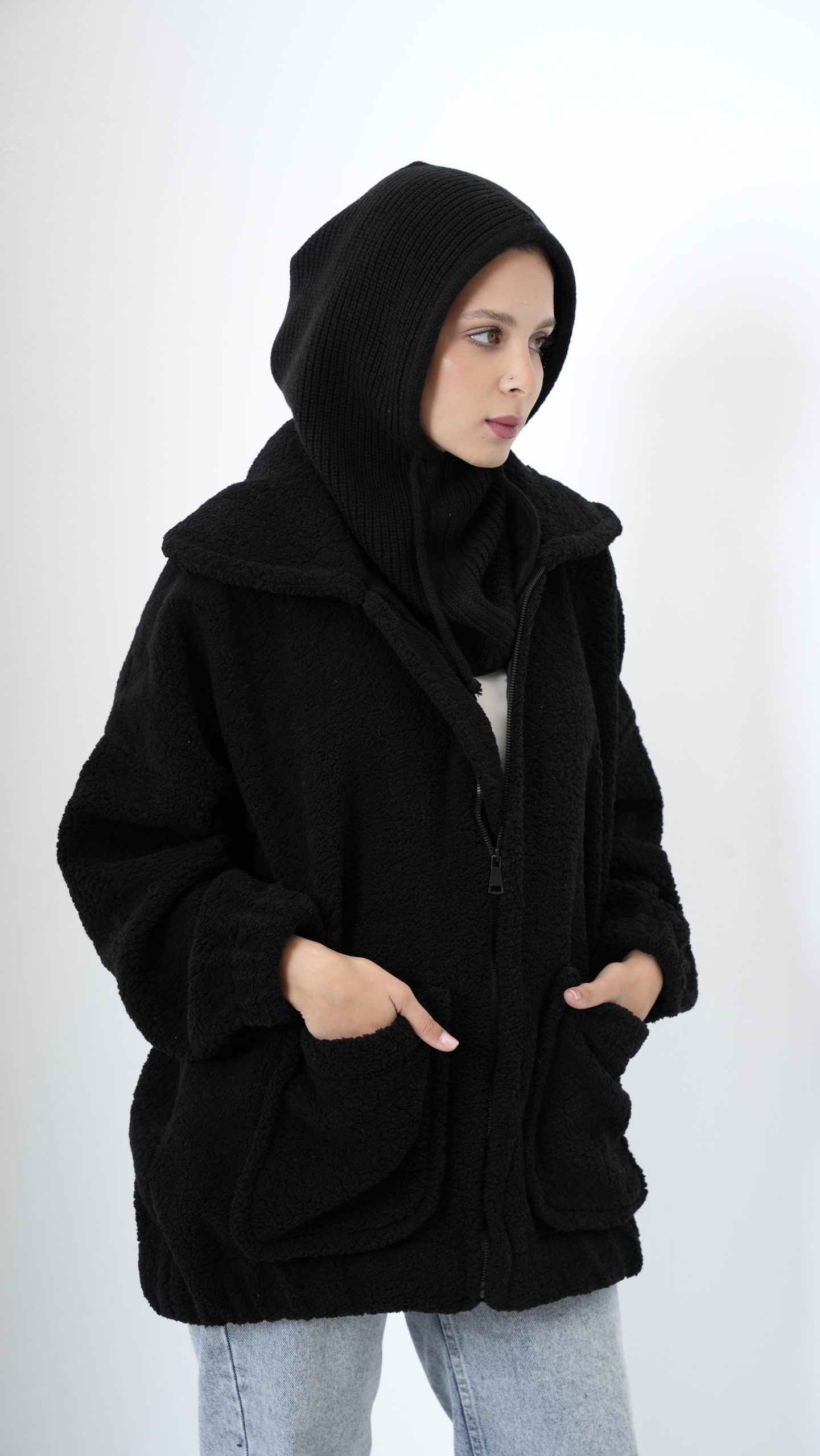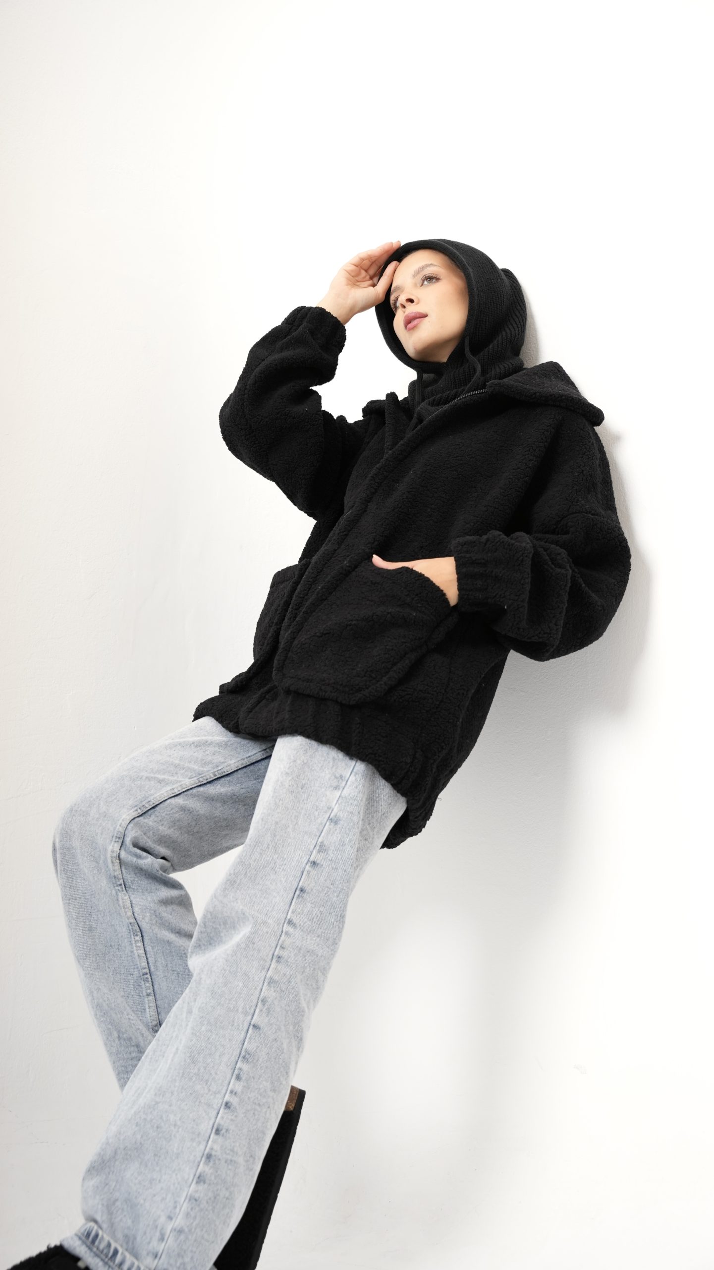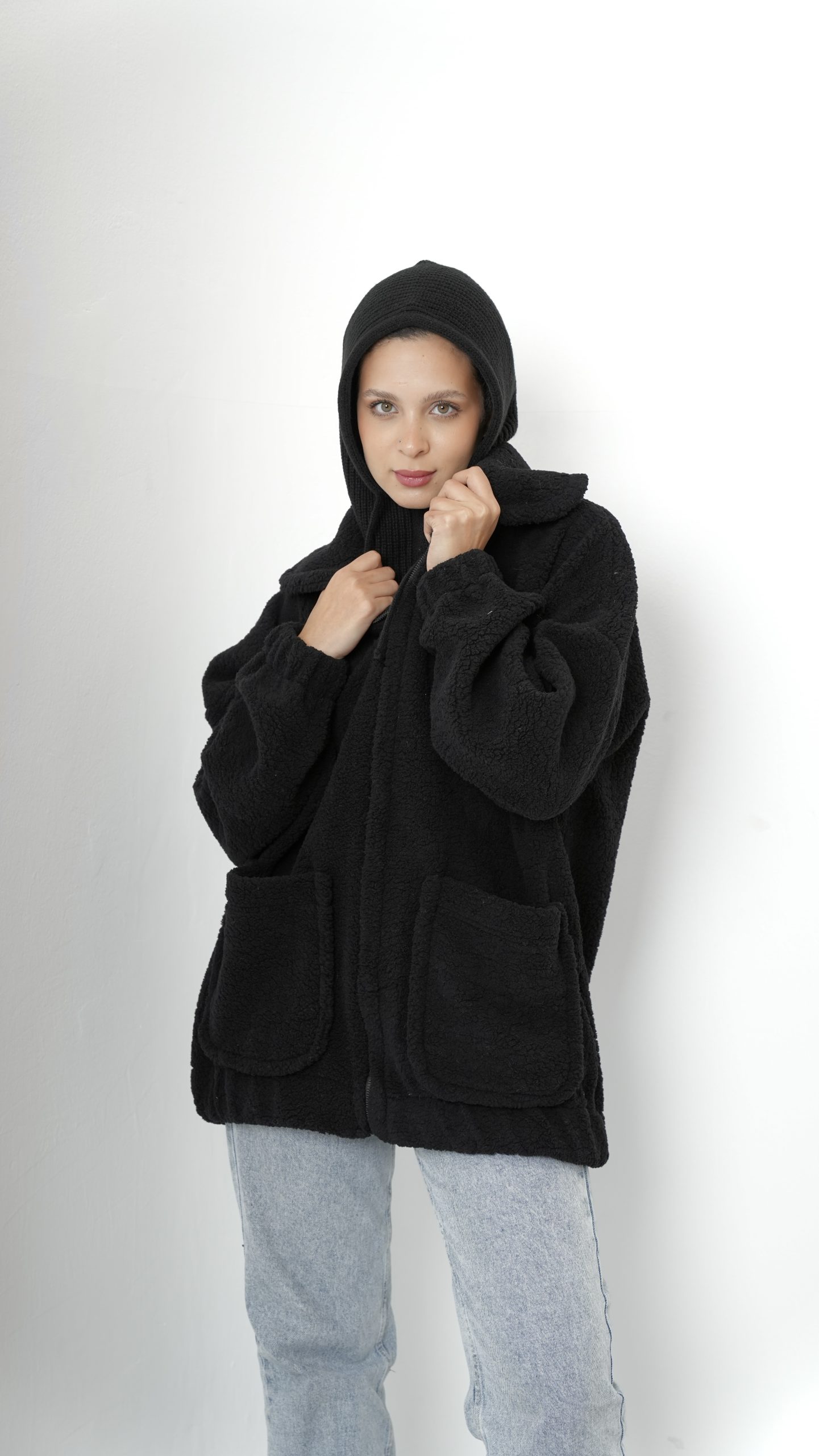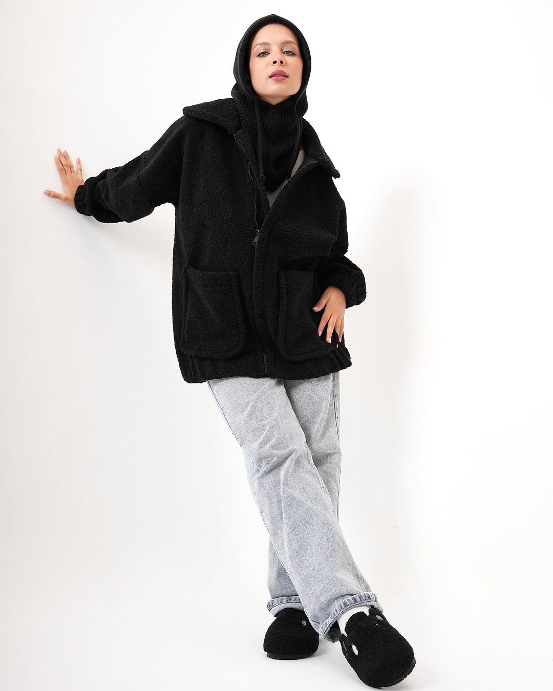 black fur jacket with soft and comfortable design. It has a front zipper closure and practical side pockets, perfect for cold weather and a stylish everyday look.
