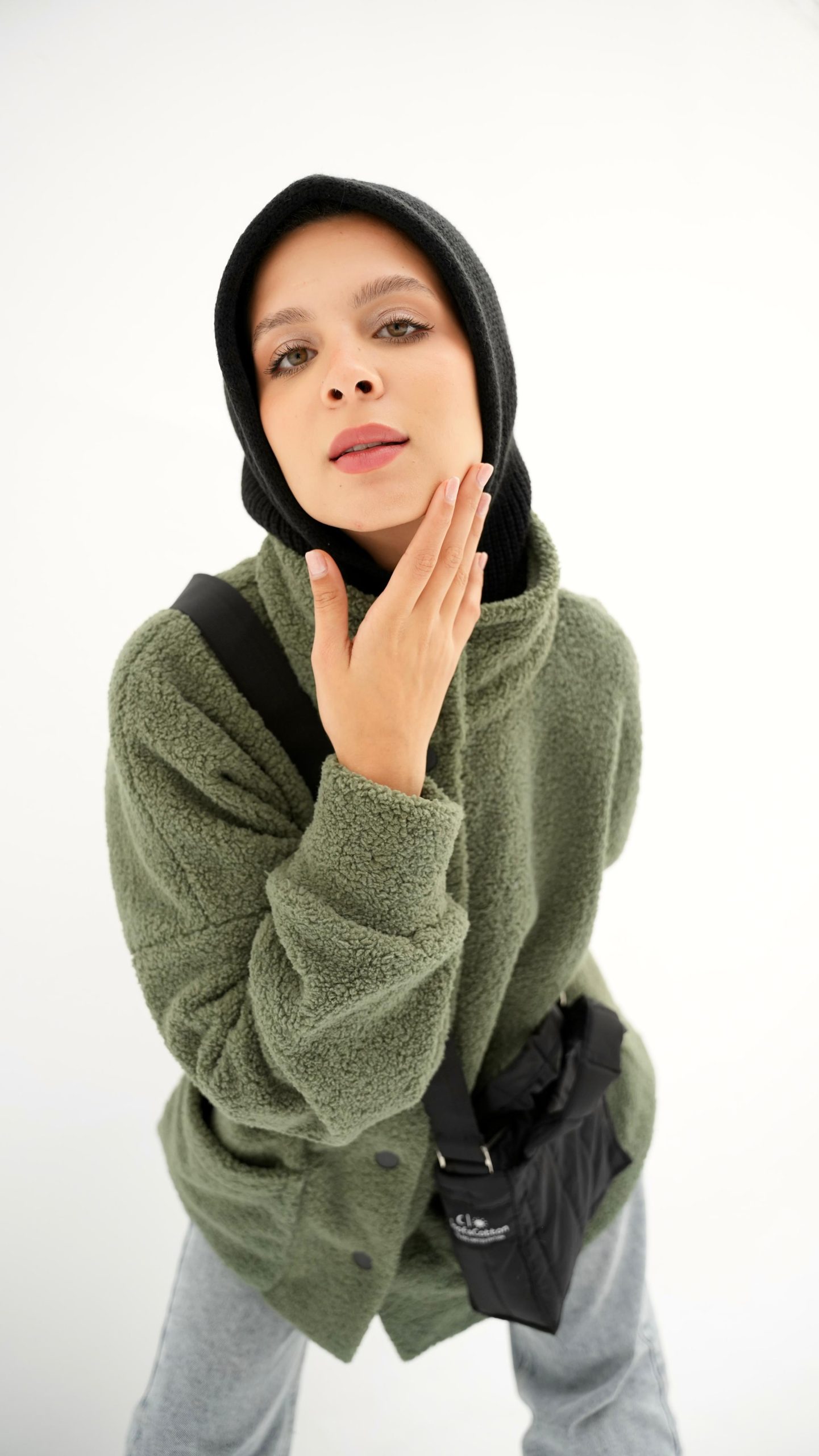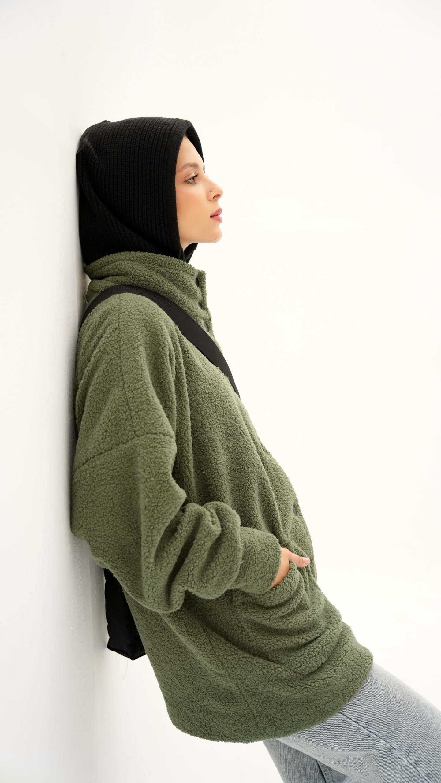 Green fur jacket with soft and comfortable design. It has front snap closure and practical side pockets, perfect for cold weather and a stylish everyday look