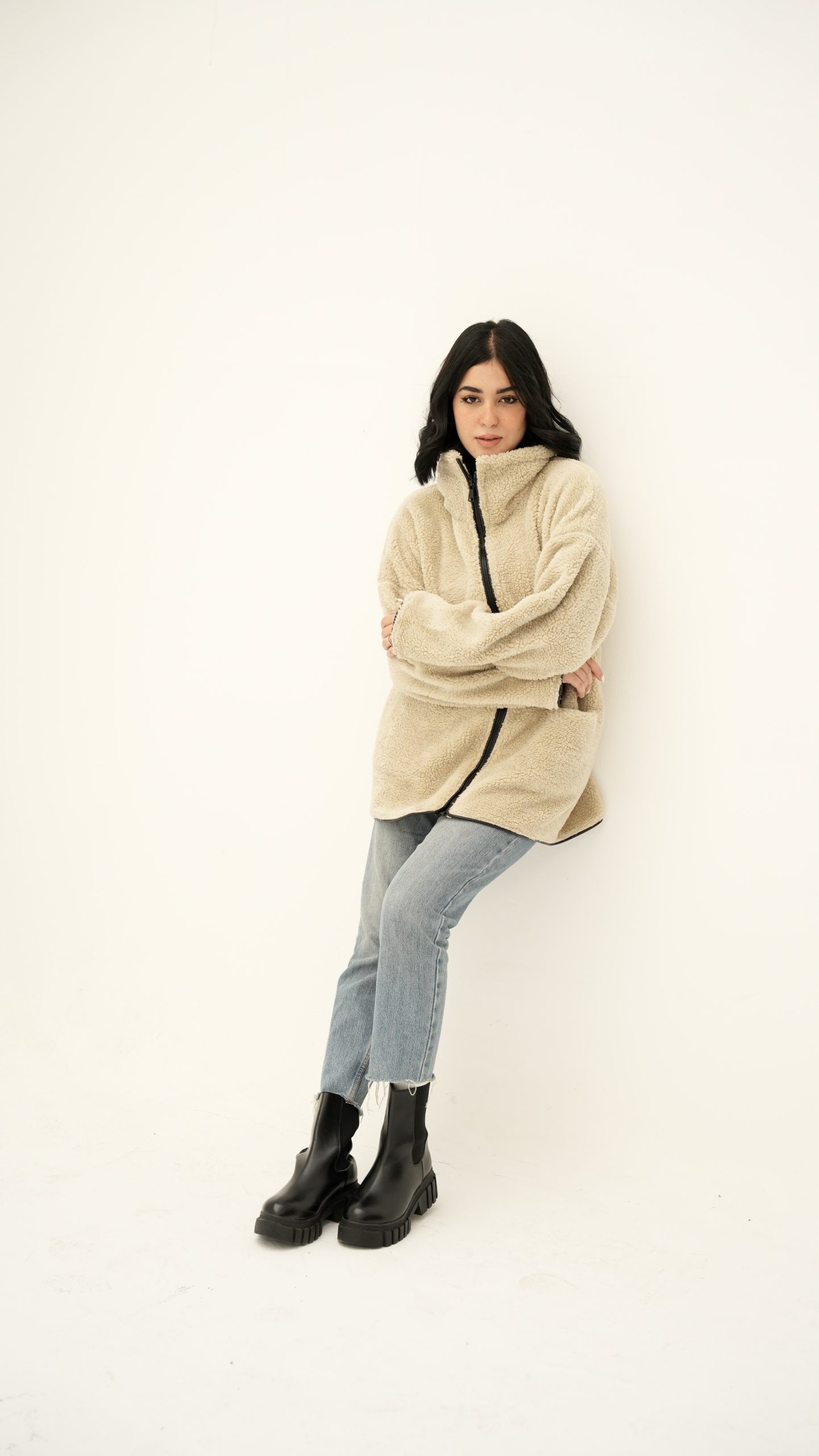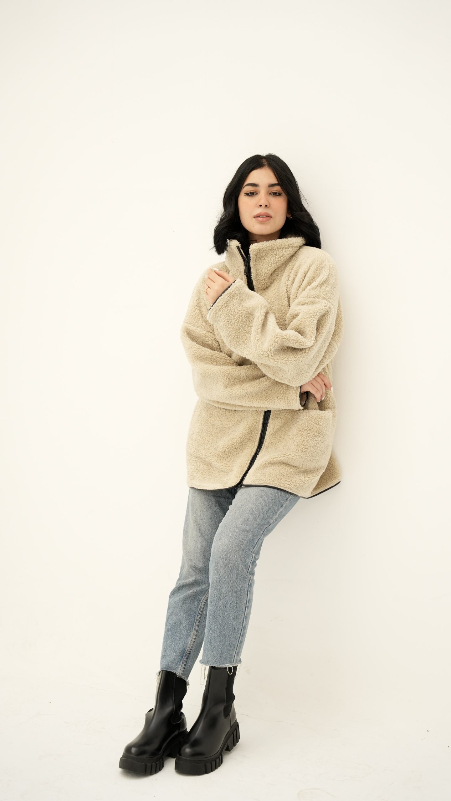 light beige fur jacket with soft and comfortable design. It has a front zipper closure and practical side pockets, perfect for cold weather and a stylish everyday look. one size Its length is 75 Its width is 60EGP 950.00 -