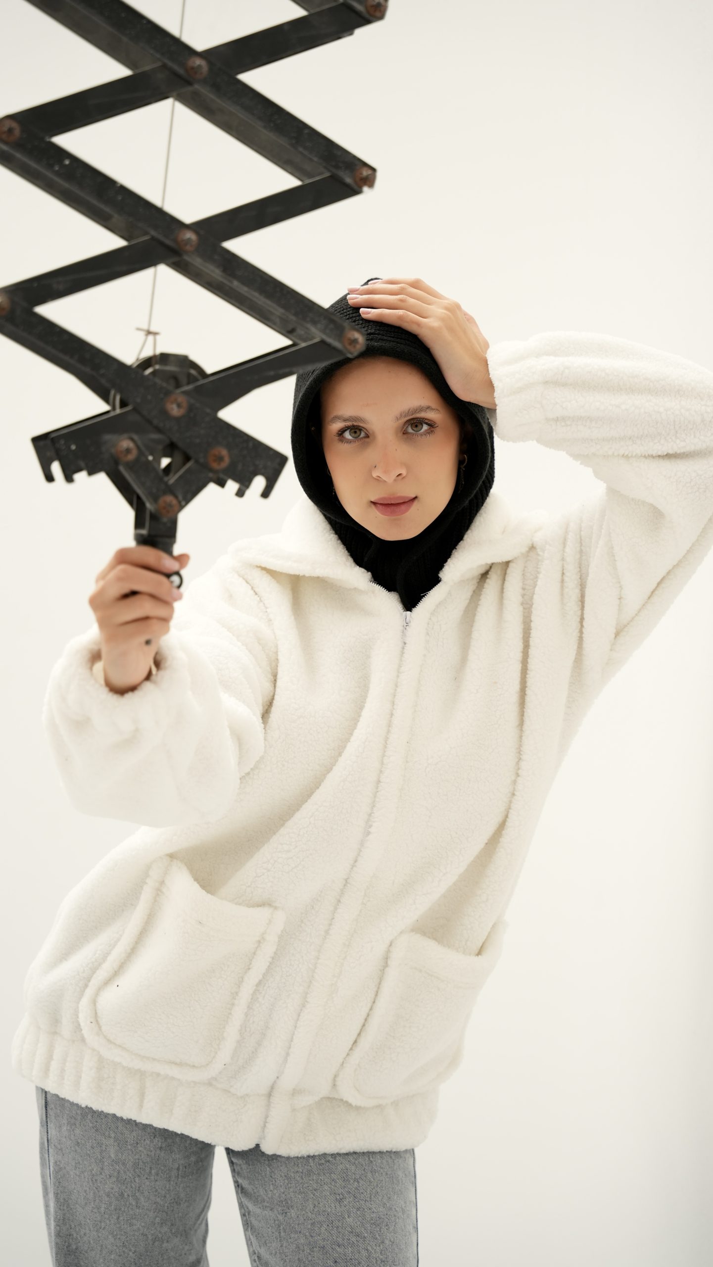 white fur jacket with soft and comfortable design. It has a front zipper closure and practical side pockets, perfect for cold weather and a stylish everyday look.