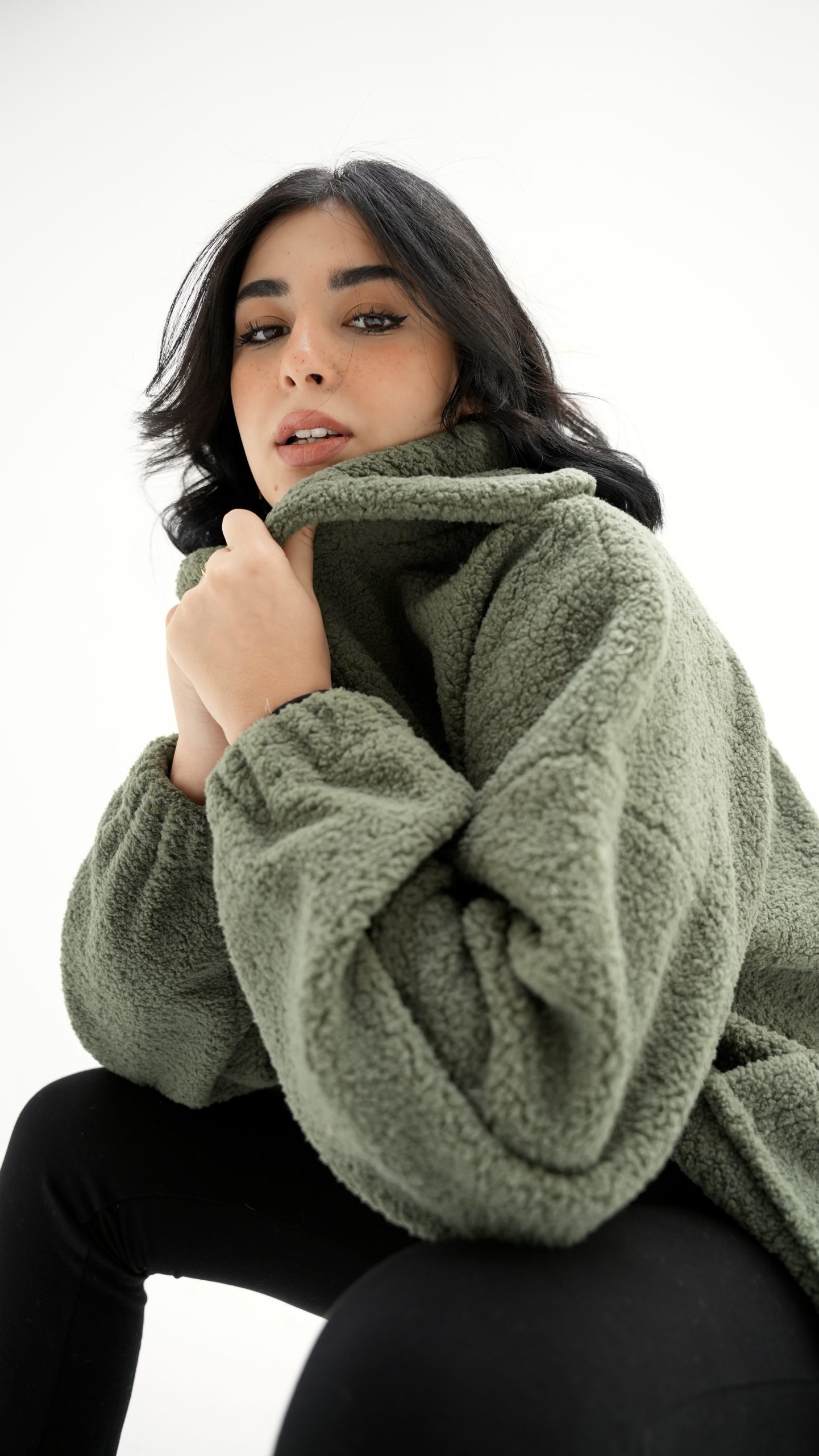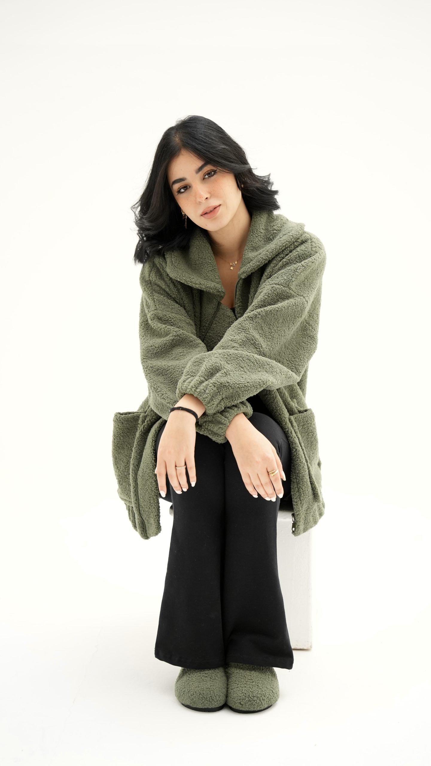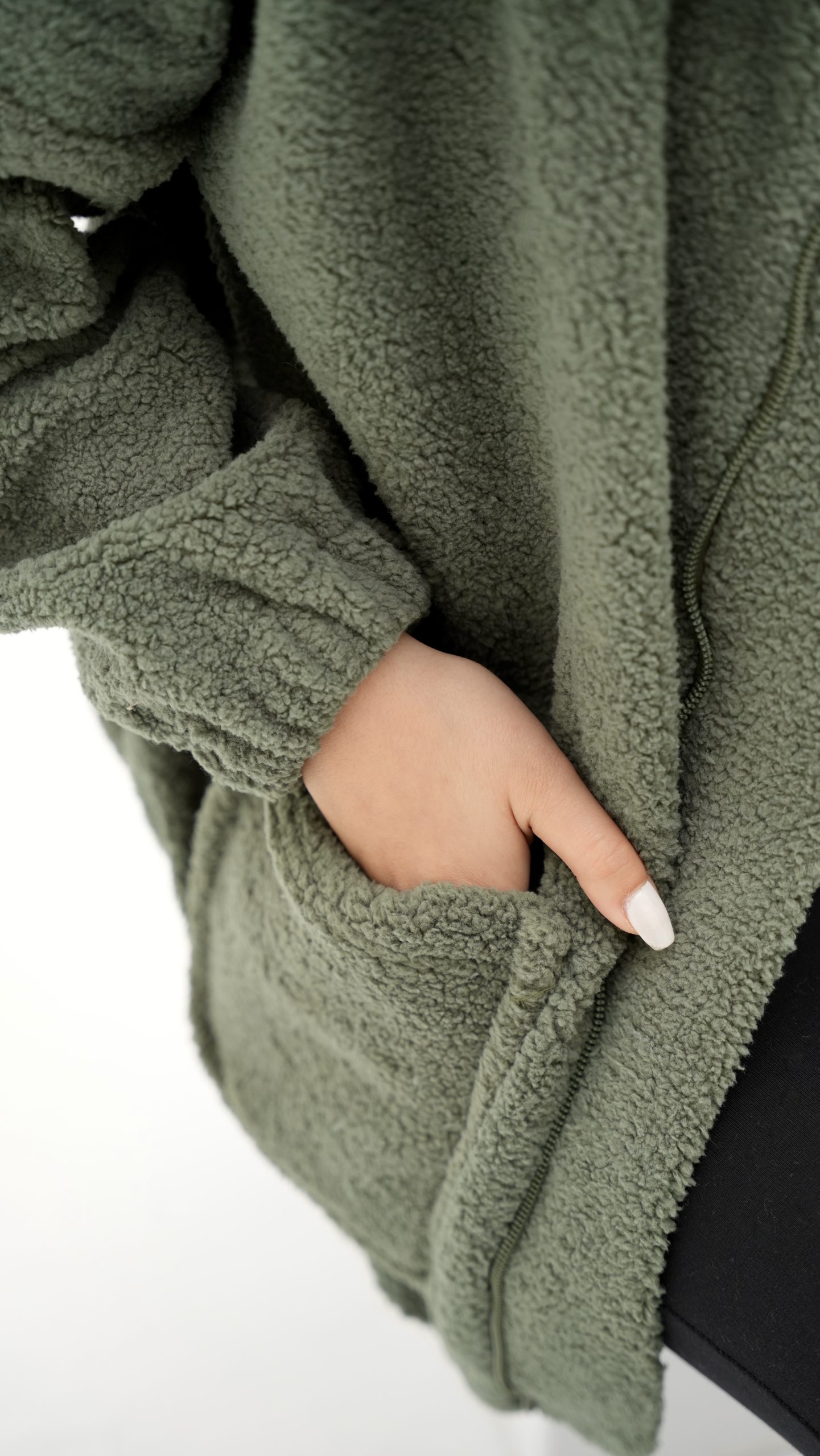 green fur jacket with soft and comfortable design. It has a front zipper closure and practical side pockets, perfect for cold weather and a stylish everyday look.