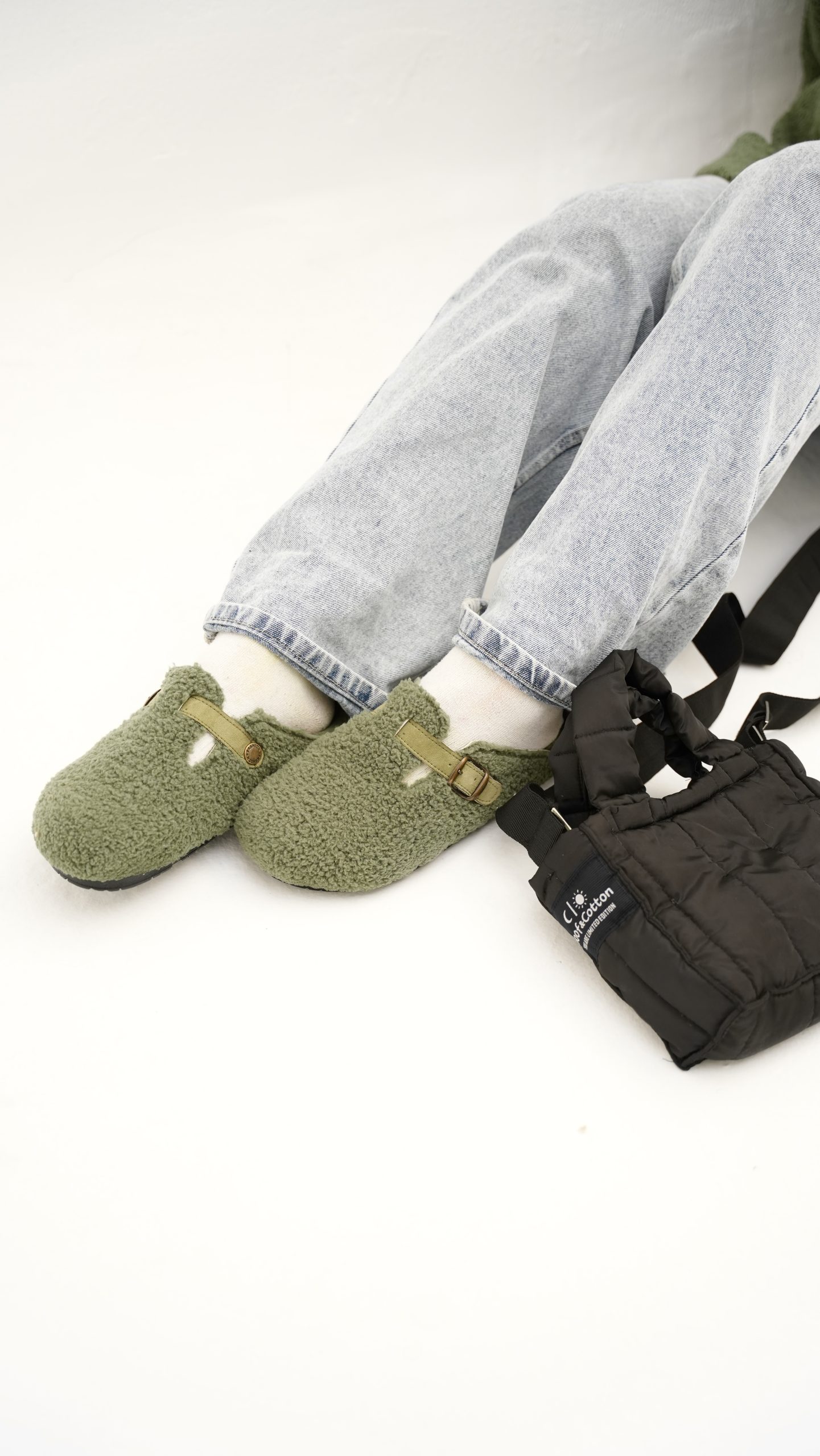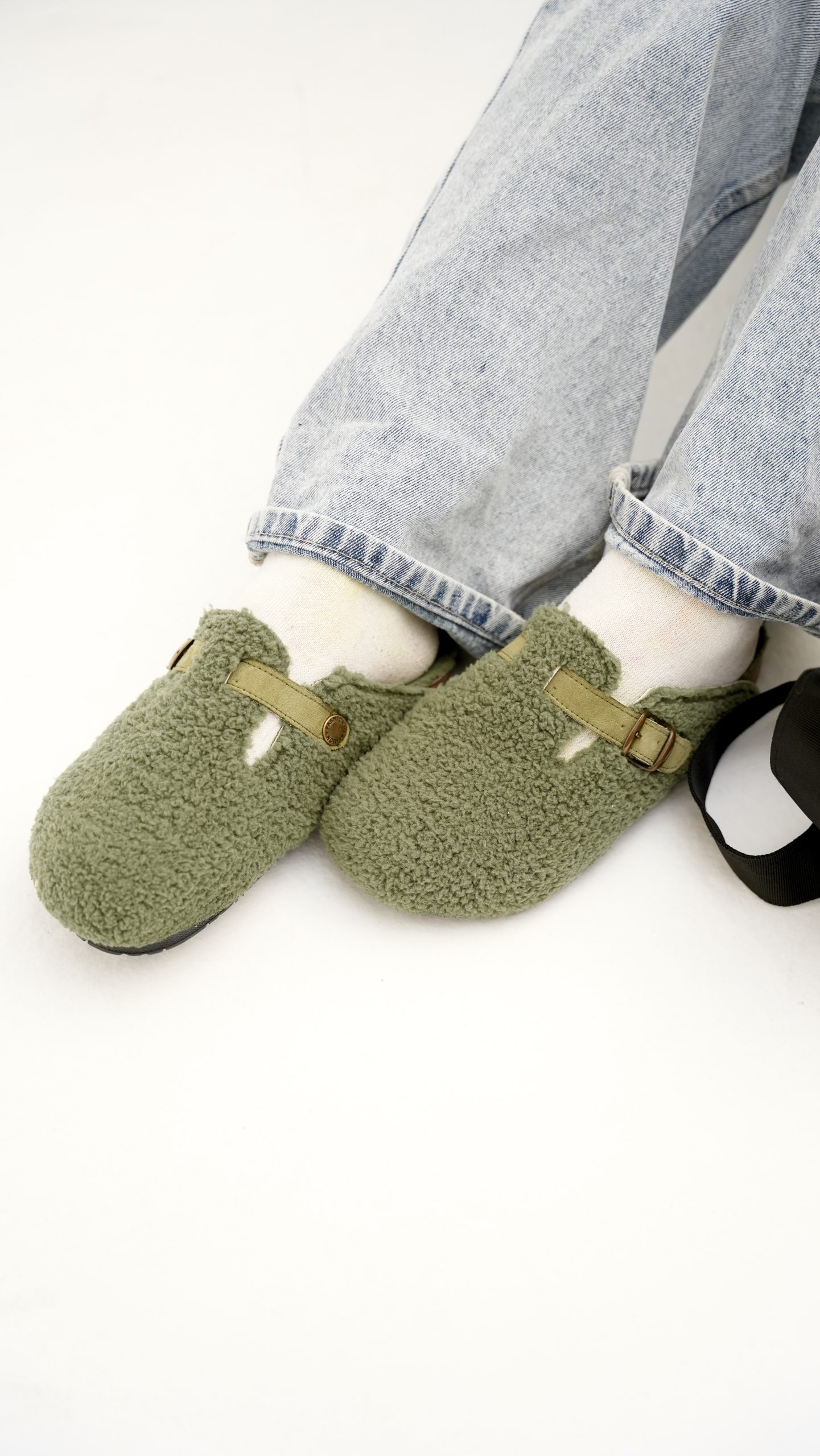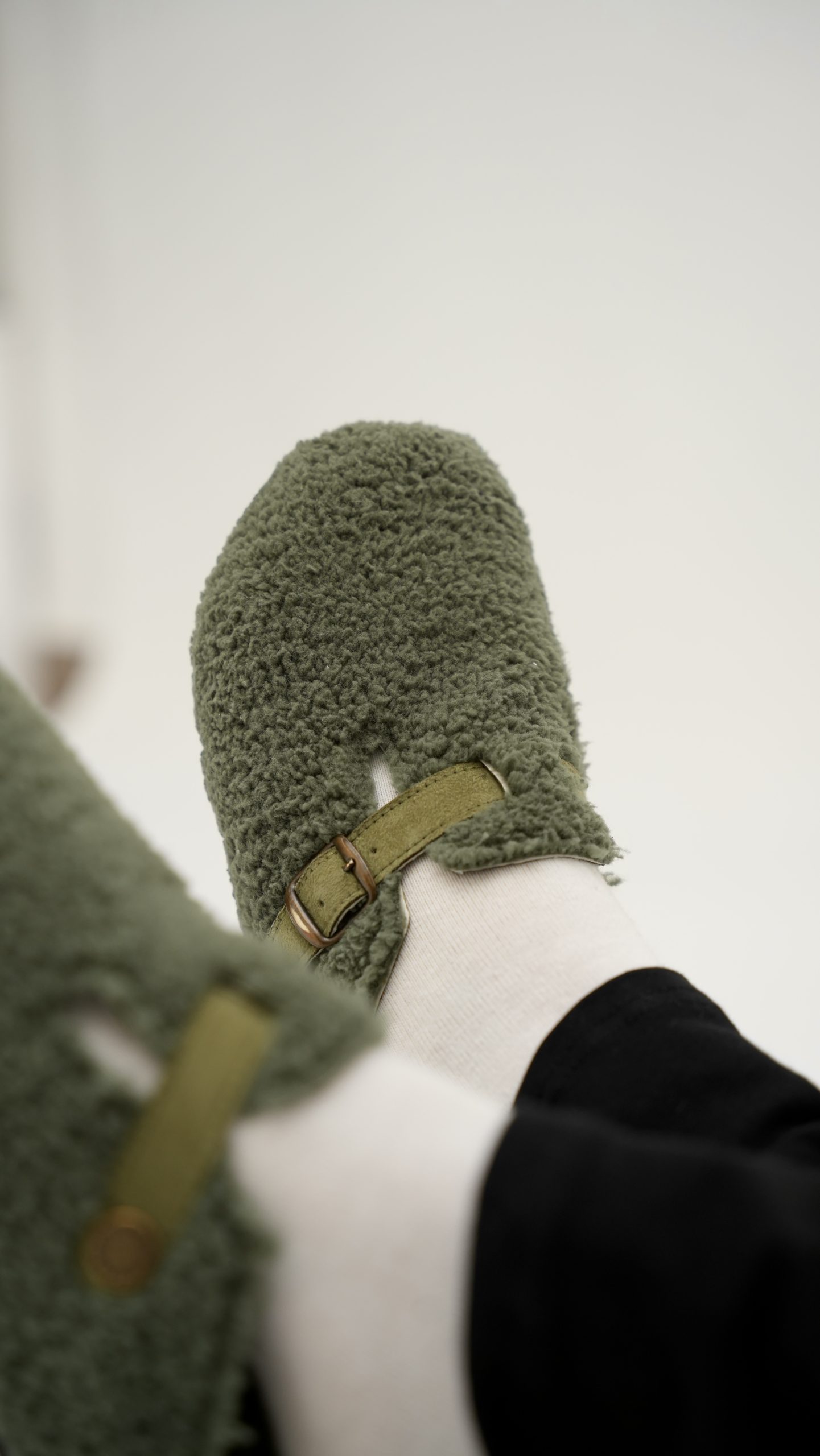 Clogs with fur on the outside and fur on the inside, made of high-quality materials in green