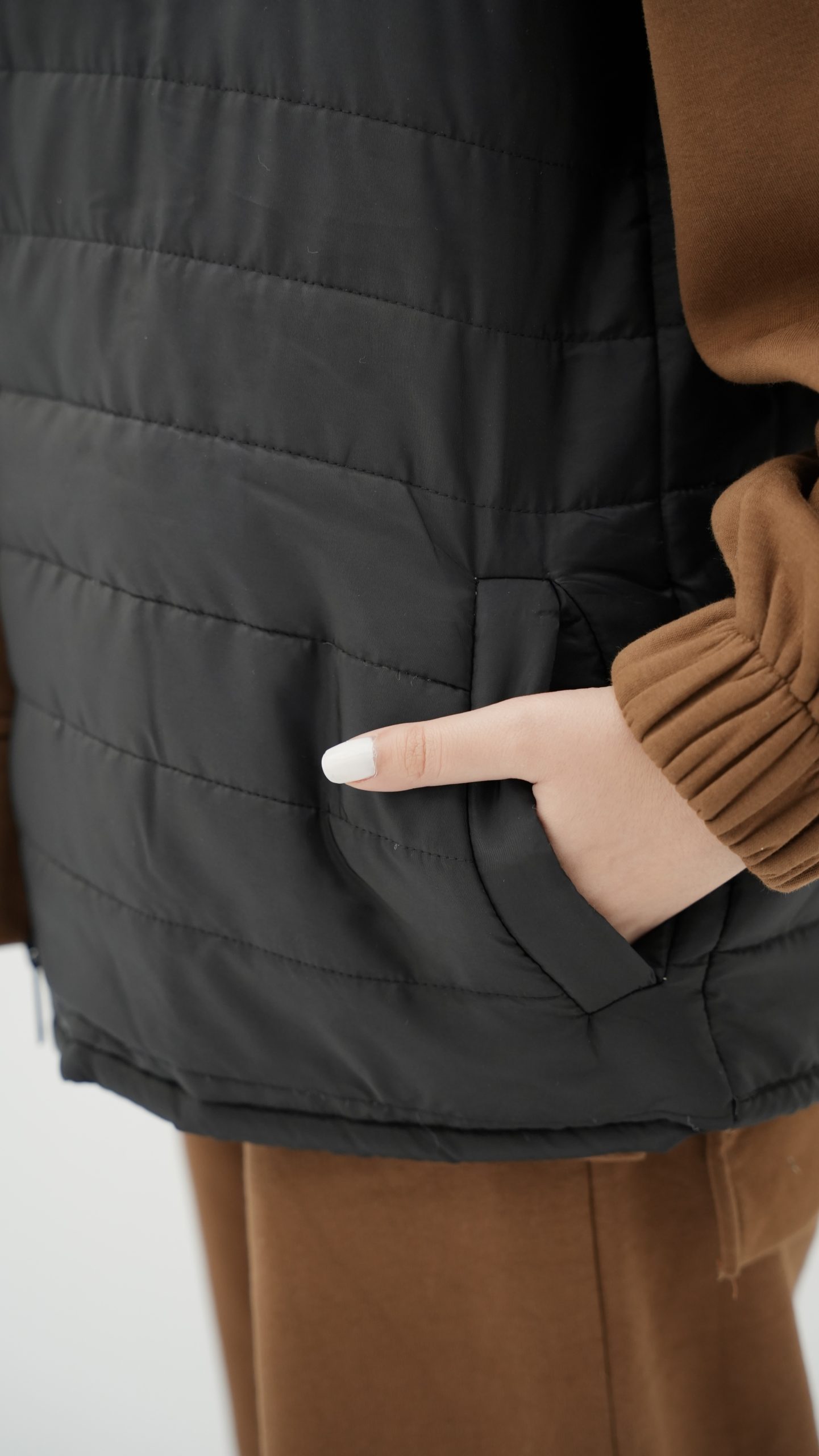 Black pumb vest with or without hood, one size and has 75″ length and 65″ width
